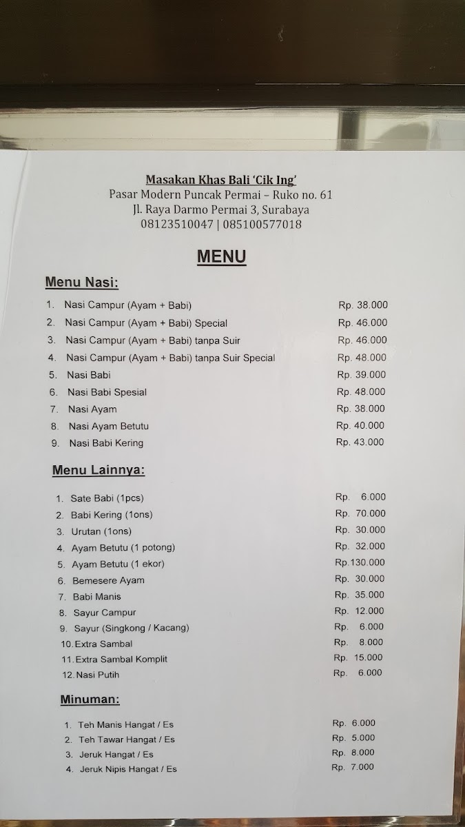 Masakan Khas Bali Cik Ing is a culinary gem located in Surabaya, East Java. Renowned for its authentic Balinese dishes, this restaurant specializes in Nasi Campur Bali, featuring generous portions of sautéed long beans, tender chicken, and crunchy roast pork. Patrons appreciate the homemade quality and a variety of flavorful offerings, often complemented by the must-try sambal bawang khas Bali. While the prices may be on the higher side, the robust flavors and nourishing ingredients justify the splurge. With comfortable air-conditioned dining amidst a bustling market, it's a delightful destination for those seeking a genuine taste of Bali.